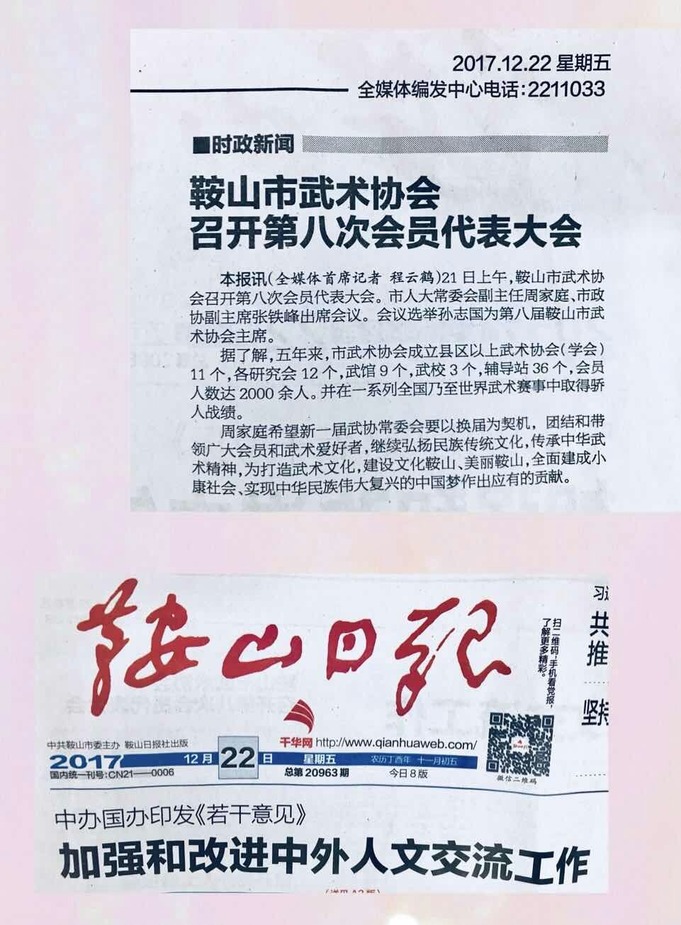 《鞍山日报》登载《鞍山市武术协会召开第八次会员代表大会》。